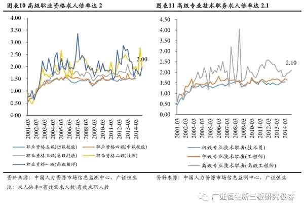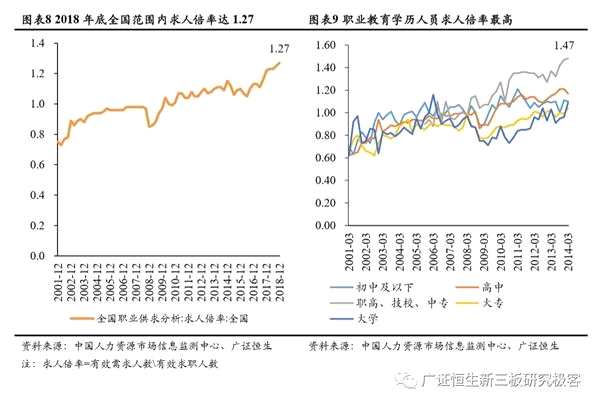 根據(jù)中國人力資源市場信息監(jiān)測中心數(shù)據(jù),2018年12月全國人才市場求人倍率(有效需求人數(shù)/有效求職人數(shù))達(dá)1.27,較2001年上漲74%。從學(xué)歷層次來看,職高、技校、大專學(xué)歷的藍(lán)領(lǐng)型技術(shù)型人才在2014年已達(dá)1.47,按照全國數(shù)據(jù)同比例上漲粗略保守估計2018年約上升至1.7-1.8之間。而高級職業(yè)資格及高級專業(yè)技術(shù)職務(wù)人員求職倍率在2014年已分別達(dá)2.0、2.1,保守估計2018年約上升至2.3-2.5之間。從教育部2017年發(fā)布的《制造業(yè)人才發(fā)展規(guī)劃指南》預(yù)測數(shù)據(jù)來看,新一代信息技術(shù)產(chǎn)業(yè)、高檔數(shù)控機床等制造業(yè)十個重點領(lǐng)域的2020年人才缺口約1913萬,2025年將上升至2896萬。