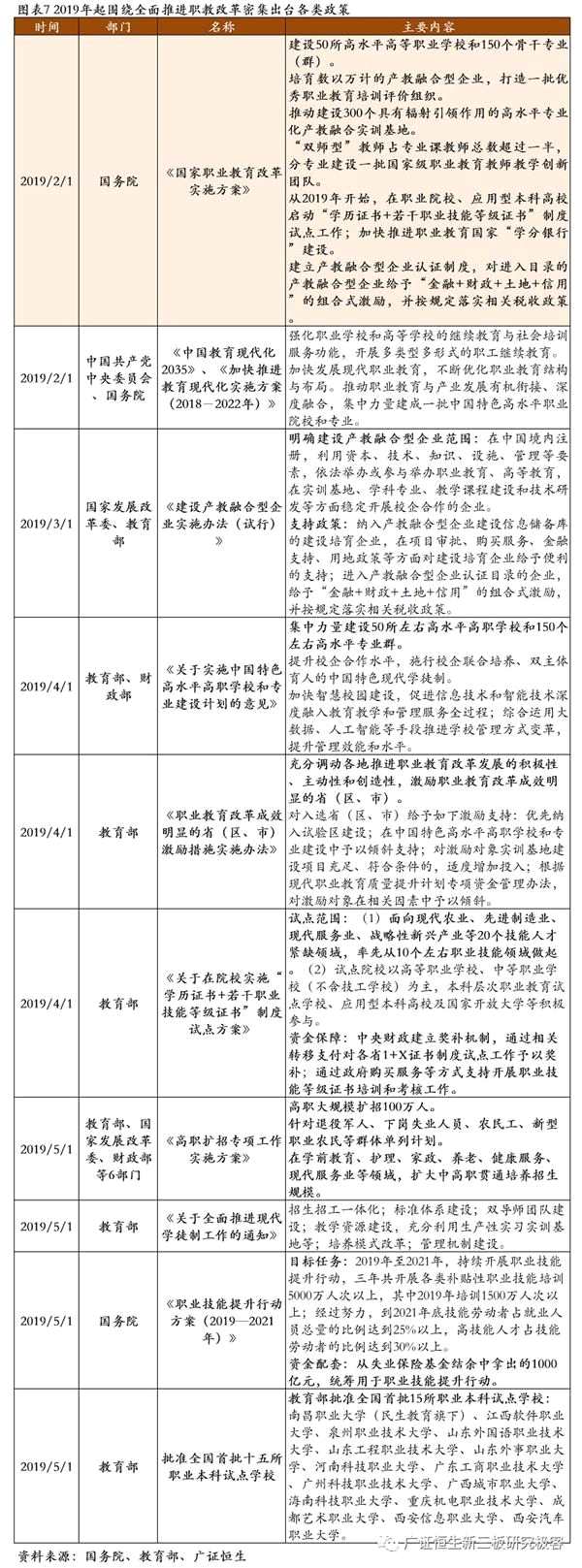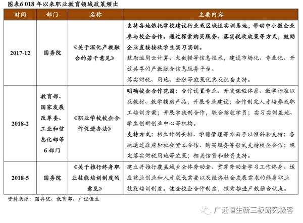 (4)第四階段(2019年起):2019年上半年職教政策持續(xù)密集出臺,當(dāng)前階段政策以《國家職業(yè)教育改革實施方案》為核心,在頂層設(shè)計的指引下以各類配套政策為職教全面改革擬定了詳細(xì)的路徑。我們認(rèn)為,