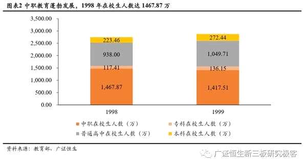 該時期的學(xué)生結(jié)構(gòu)以中等職業(yè)教育為主。從可追溯的早期在校學(xué)生人數(shù)來看,該階段中職教育蓬勃發(fā)展,人數(shù)遠(yuǎn)超普通高中,而高等職業(yè)教育(專科)及普通高校(本科)本科尚處于起步階段,這也和我國早期的經(jīng)濟(jì)發(fā)展階段相契合。