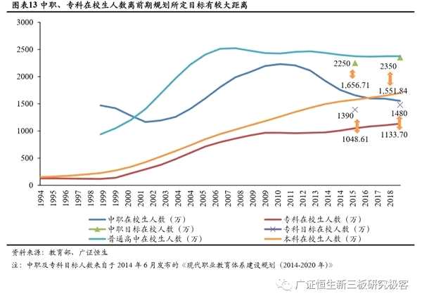 從過往國家制定的各層次教育的在校生人數(shù)發(fā)展目標(biāo)來看,2020年中等職業(yè)教育在校生人數(shù)目標(biāo)為2350萬,專科層次職業(yè)教育1480萬,本科層次教育1175萬。2018年中職在校生人數(shù)為1551.84萬,??茷?133.70萬;2017年本科在校生人數(shù)為1648.63萬。目前中職缺口約800萬,??迫笨跒?50萬,而本科人數(shù)超出計劃目標(biāo)約470萬。
