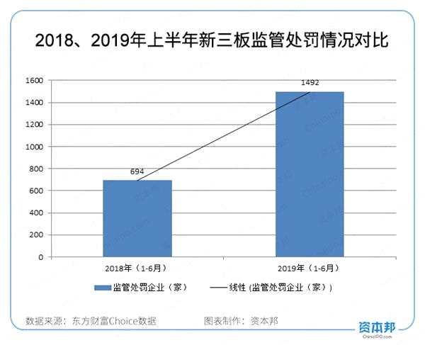 截止2019年6月30日,新三板遭監(jiān)管處罰企業(yè)達1492家,去年同期被監(jiān)管處罰694家,同比增長了798家,同比增長率達到114.99%。