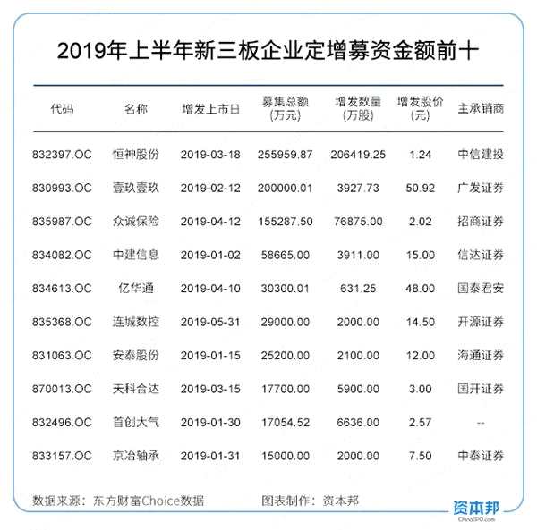 從募資金額來看,今年上半年實施完成定增的企業(yè)中,恒神股份、壹玖壹玖、眾誠保險分別以25.60億元、20.22億元、15.53億元的募資金額榮登三甲。募資金額前十大企業(yè)分別如下: