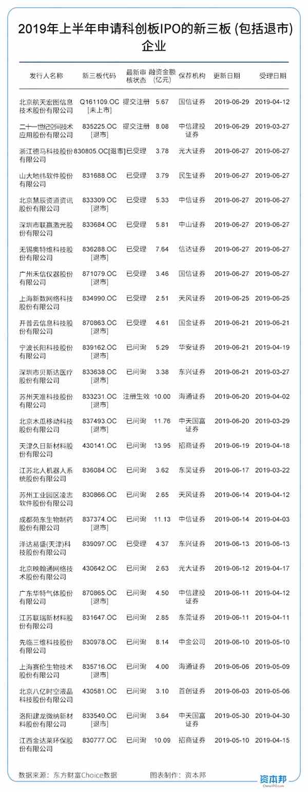 擬科創(chuàng)板IPO:從受理日期來看,2019年上半年共有27家新三板企業(yè)申請科創(chuàng)板IPO。其中西部超導在6月20日順利過會,成為過會企業(yè)中的新三板第一股。具體情況如下: