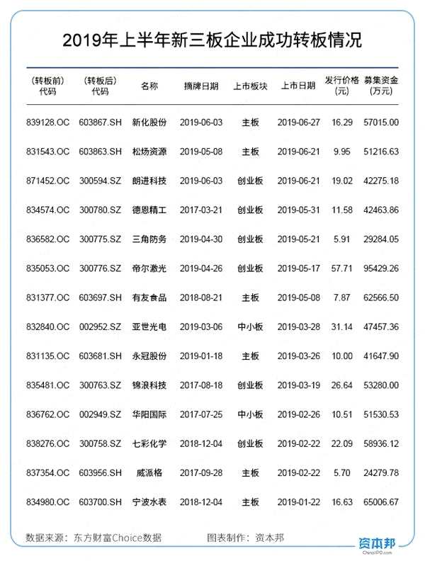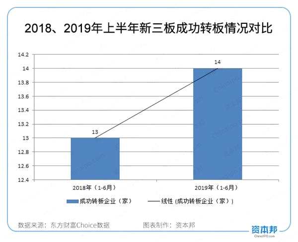 成功轉(zhuǎn)板:從上市日期來看,新三板2019年上半年共有14家企業(yè)成功轉(zhuǎn)板,2018年同期成功轉(zhuǎn)板企業(yè)13家,基本持平。