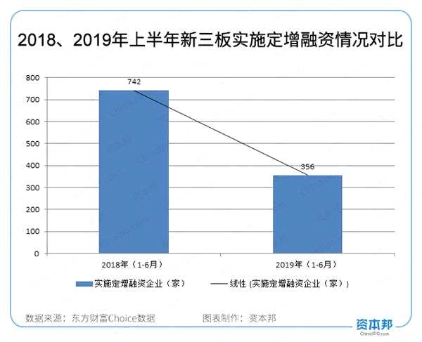 定增融資實施情況:從增發(fā)上市日來看,2019年上半年共有356家新三板企業(yè)實施定增融資,2018年同期實施定增企業(yè)742家,同比減少386家,同比下降108.43%。