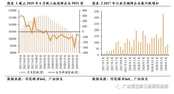 市場規(guī)模:截止到2019年6月30日,新三板掛牌企業(yè)數(shù)下降至9921家,重回“萬家”以下。今年內(nèi)共923家企業(yè)摘牌,比去年同期的707家增加了30.55%。
