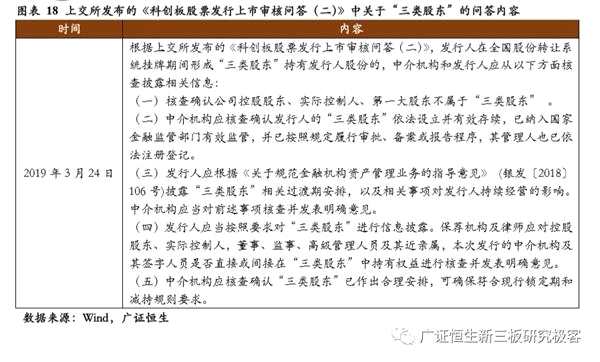 對于新三板企業(yè)而言,科創(chuàng)板的另一大制度突破在于“三類股東”障礙的清除。2018年1月以前,發(fā)審委對三類股東的審核口徑并不明確。2018年1月13日,證監(jiān)會首次明確了三類股東的審核口徑:要求帶有“三類股東”上會的企業(yè)對全部“三類股東”進行穿透式披露。實務(wù)中,相當(dāng)部分企業(yè)因穿透成本高、時間長、部分最終出資人無法找到等原因而最終放棄IPO.2019年3月1日,隨著科創(chuàng)板制度的正式落地,科創(chuàng)板對“三類股東”的核查口徑也得到了進一步的明確?!渡虾WC券交易所科創(chuàng)板股票上市規(guī)則》以及《科創(chuàng)板股票發(fā)行上市審核問答(二)》均未要求對全部三類股東進行穿透式披露。實務(wù)上,【西部超導(dǎo)(688122)、股吧】已帶著未穿透的“三類股東”注冊生效,可見對新三板企業(yè)而言,“三類股東”的障礙已基本消除。