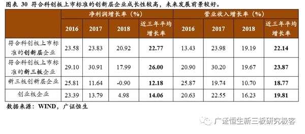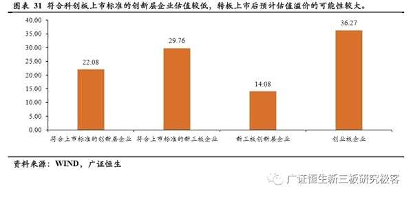 基于我們的測算,符合科創(chuàng)板上市標(biāo)準(zhǔn)的新三板創(chuàng)新層企業(yè)成長性較為顯著,公司質(zhì)地相對優(yōu)良,并且估值相對偏低,轉(zhuǎn)板后估值溢價的可能性較大。具體地,從企業(yè)質(zhì)地看,符合科創(chuàng)板上市標(biāo)準(zhǔn)的創(chuàng)新層企業(yè)近三年平均凈利潤增長率和營業(yè)收入平均增長率分別為22.77%和22.14%,而新三板創(chuàng)新層整體為12.18%和18.77%,創(chuàng)業(yè)板整體為14.06%和19.81%。從估值上看,符合科創(chuàng)板上市標(biāo)準(zhǔn)的創(chuàng)新層企業(yè)的平均估值為22.08倍,而流動性較高的創(chuàng)業(yè)板企業(yè)整體估值為36.27倍,估值尚有差距,建議密切關(guān)注符合科創(chuàng)板上市標(biāo)準(zhǔn)的創(chuàng)新層企業(yè)的投資機會。