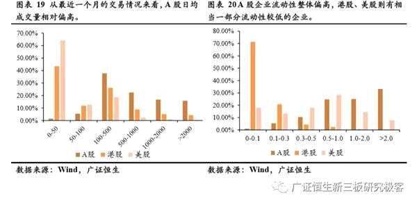 科創(chuàng)板的“市場化”特征將加強市場企業(yè)間的分化,長期看科創(chuàng)板流動性會出現(xiàn)明顯的“馬太效應(yīng)”,流動性將往優(yōu)質(zhì)企業(yè)集中。目前A股成交量及換手率均相對偏高,呈現(xiàn)出明顯的左偏分布,僅有0.91%的企業(yè)日均換手率低于0.1%;上市審核相對寬松的港股市場的成較量及換手率則主要呈現(xiàn)右偏的分布,有53.66%的企業(yè)日均換手率低于0.1%,存在大量無交易的“仙股”;制定了嚴(yán)格退市制度的美股的換手率則更為分化,換手率分布在不同區(qū)間的企業(yè)比例相對平均。我們預(yù)計,同樣采用注冊制、嚴(yán)格退市制度及其他市場化制度的科創(chuàng)板推出后,可能呈現(xiàn)出與港股美股相似的流動性分化局面,資金聚焦頭部企業(yè),其他企業(yè)的流動性將相對偏低。