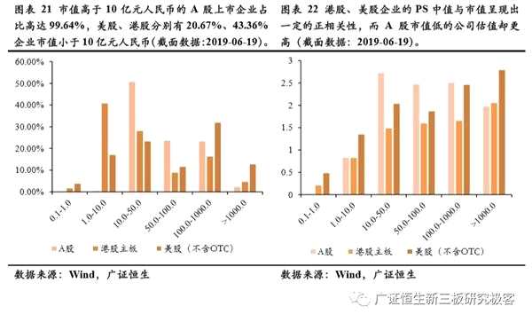 市值結(jié)構(gòu)也或?qū)⒆呦騼蓸O分化,僅優(yōu)質(zhì)企業(yè)有望獲得高估值。A股上市企業(yè)市值整體偏高,并且過半企業(yè)集中在10-50億元的市值區(qū)間。而港股和美股市場上市公司市值結(jié)構(gòu)較為分散,分別有42.36%、20.67%的企業(yè)市值小于10億元人民幣。A股企業(yè)市值與其市場估值不相匹配,市值低的企業(yè)反而估值高,存在資源錯配現(xiàn)象。不同于A股,港股和美股企業(yè)的PS估值與市值正相關(guān)性較強,換言之,市值高的企業(yè)才能獲得相應(yīng)的高估值。我們認(rèn)為,與港股和美股更相似的科創(chuàng)板在落地后,企業(yè)市值或?qū)⒊尸F(xiàn)出分化的特征,市場關(guān)注點將聚焦頭部,只有優(yōu)質(zhì)企業(yè)才會獲得高估值。