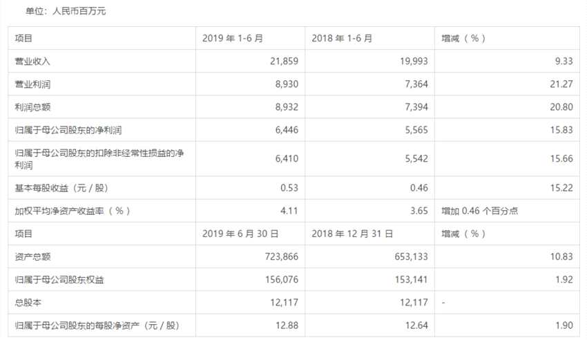 2019年上半年,營業(yè)收入218.59億元,同比上升9.33%;歸屬于母公司股東的凈利潤64.46億元,同比上升15.83%。