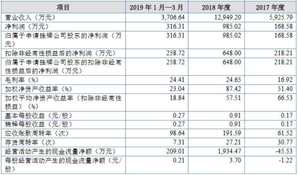 財務方面,九龍珠2017年,2018年及2019年1月—3月,營收分別為5,925.79萬元、12,949.20萬元、3,706.64萬元。歸屬于申請掛牌公司股東的凈利潤為168.58萬元、985.02萬元、316.31萬元。