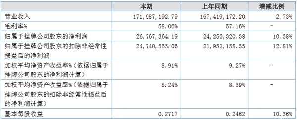 報告顯示,2019上半年環(huán)球藥業(yè)營業(yè)收入171,987,192.79元,同比增長2.73%,歸屬于掛牌公司股東的凈利潤26,767,364.19元,同比增長10.38%。