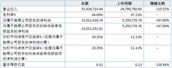 報告顯示,2019上半年文龍中美營業(yè)收入53,428,714.94元,同比增長115.52%,歸屬于掛牌公司股東的凈利潤13,011,418.76元,同比增長147.80%。