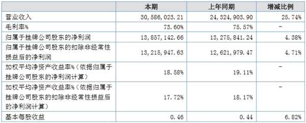 報(bào)告顯示,2019上半年武漢藍(lán)電營(yíng)業(yè)收入30,586,023.21元,同比增長(zhǎng)25.74%,歸屬于掛牌公司股東的凈利潤(rùn)13,857,142.66元,同比增長(zhǎng)4.38%。