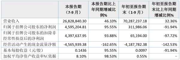 報告顯示,一特股份前三季度營業(yè)收入70,287,237.18元,同比增長32.36%,歸屬于掛牌公司股東的凈利潤311,986.06元,同比減少91.94%。