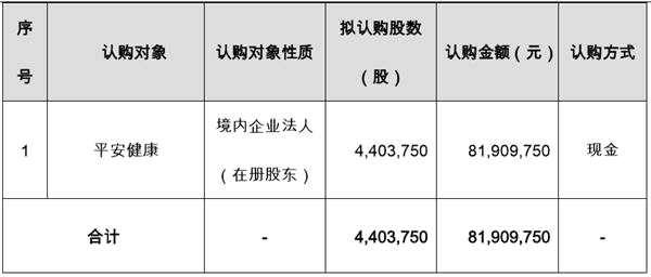 本次股票發(fā)行屬于確定對象的股票發(fā)行,發(fā)行對象為平安健康,系公司現(xiàn)有在冊股東。本次股票發(fā)行的認購對象、擬認購股數(shù)、認購金額等信息如下: