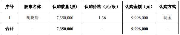 報告書顯示,中延股份以1.36元/股的價格發(fā)行股票7,350,000股,由胡曉唐以現(xiàn)金認購方式認購。具體認購數(shù)量及金額如下: