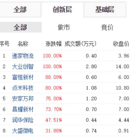 遞家物流、大業(yè)創(chuàng)智兩家創(chuàng)新層公司股價漲幅達100%,點米科技等6只創(chuàng)新層個股股價漲幅超過30%。