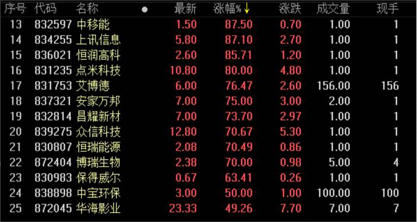 值得關(guān)注的是,有9家創(chuàng)新層公司漲幅超30%,飛利富(870361)的漲幅最大,為100%;遞家物流(832178)緊隨其后,漲幅為80%;食安科技(430437)漲幅為75%,其余6只股票的漲幅則介于30%-50%之間,分別是易家科技(836792)、宇林德(870170)、廣爾數(shù)碼(838324)、百通能源(835359)、馬上游(833158)、天河股份(831162)。