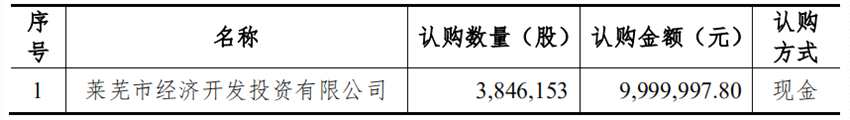 報(bào)告書(shū)披露,本次發(fā)行股票種類(lèi)為人民幣普通股,擬發(fā)行股票數(shù)量不超過(guò)3,846,153股(含),實(shí)際發(fā)行股票數(shù)量為3,846,153股。本次股票發(fā)行價(jià)格為人民幣2.6元/股。本次預(yù)計(jì)募集資金總額不超過(guò)人民幣9,999,997.80元(含),實(shí)際募集資金為人民幣9,999,997.80元。本次股票發(fā)行為確定對(duì)象發(fā)行,發(fā)行對(duì)象共1名,為公司現(xiàn)有股東萊蕪市經(jīng)濟(jì)開(kāi)發(fā)投資有限公司。