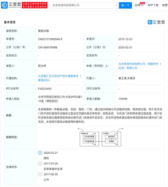 發(fā)明,北京奇虎科技有限公司,冰箱