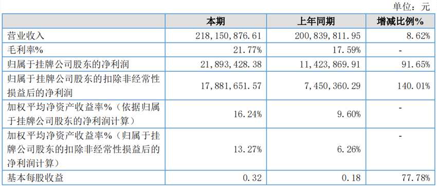 摘要: 菱湖股份(831719.OC)發(fā)布公告稱,2019年公司實(shí)現(xiàn)營業(yè)收入218,15萬元,較上年同期增長8.62%,實(shí)現(xiàn)歸屬于母公司股東的凈利潤2,189萬元,較上年同期增長91.65%。主要原因是公司調(diào)
