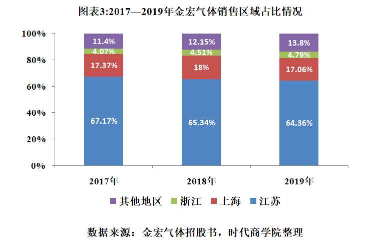 如圖表3所示,從客戶分布情況看,2017—2019年,金宏氣體來自江蘇、上海、浙江三省市的合計銷售收入占主營業(yè)務(wù)收入的比例分別為88.6%、87.85%和86.2%,銷售區(qū)域比較集中。