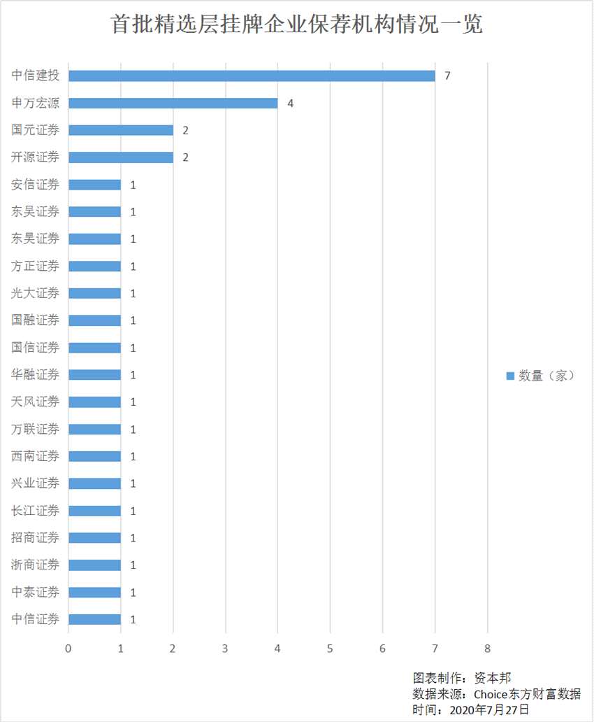 保薦機(jī)構(gòu)方面,截止7月27日,共有20家保薦機(jī)構(gòu)承擔(dān)了今年32家公司的精選層公開發(fā)行業(yè)務(wù)。最受企業(yè)青睞的為中信建投。此次精選層掛牌交易的32家企業(yè)中,有7家選擇了中信建投,占比達(dá)21.88%。申萬宏源則承擔(dān)了4家企業(yè)業(yè)務(wù),位列第二名。國元證券與開源證券并列第3,分別承擔(dān)了2家公司的業(yè)務(wù)。