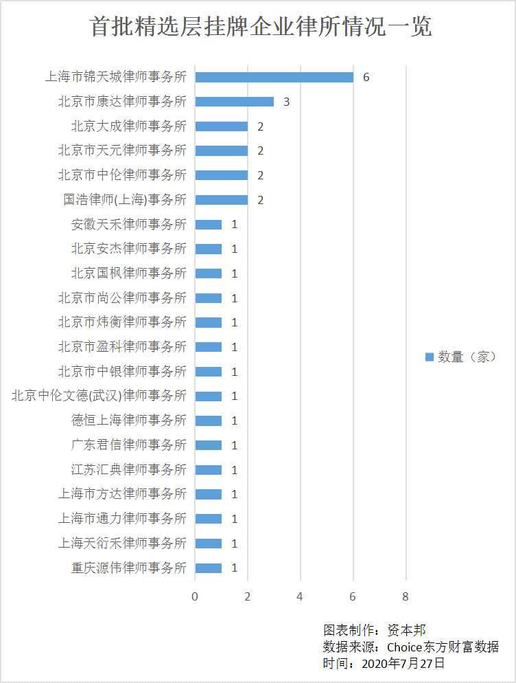 律所方面,截止7月27日,共有21家律師事務(wù)所承擔(dān)了上述企業(yè)的精選層公開發(fā)行業(yè)務(wù)。其中,承擔(dān)公司數(shù)量最多的為上海市錦天城律師事務(wù)所,服務(wù)企業(yè)數(shù)量為6家。北京市康達(dá)律師事務(wù)所承擔(dān)了3家企業(yè),北京大成律師事務(wù)所、北京市天元律師事務(wù)所、北京市中倫律師事務(wù)所、國浩律師(上海)事務(wù)所四家會(huì)所則分別承擔(dān)了2家企業(yè)。