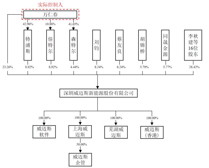 根據(jù)招股說明書顯示,威邁斯控股股東及實際控制人為萬仁春。萬仁春直接持有公司8464.86萬股,占公司總股本的23.2551%,為公司的控股股東。此外,萬仁春通過控制倍特爾、特浦斯、森特爾三個員工持股平臺,間接控制公司22.2838%的股權(quán)。因此,萬仁春直接和間接控制公司45.5389%的股權(quán)。