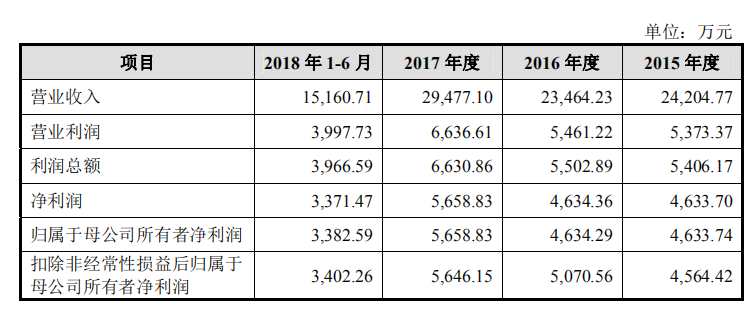 2015年至2018年1-6月,華亞智能實現(xiàn)營業(yè)收入2.42億元、2.35億元、2.95億元、1.52億元;實現(xiàn)凈利潤4633.70萬元、4634.36萬元、5658.83萬元、3371.47萬元。