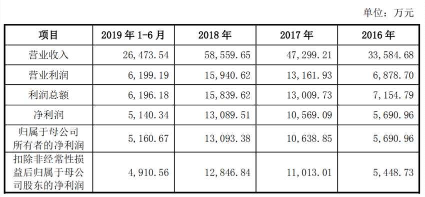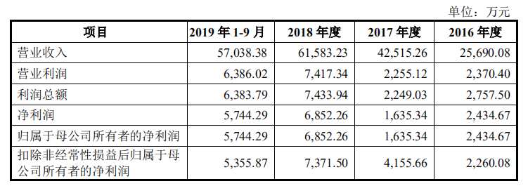 2016年至2019年1-9月,威邁斯實現(xiàn)營業(yè)收入2.57億元、4.25億元、6.16億元、5.70億元;實現(xiàn)凈利潤2434.67萬元、1635.34萬元、6852.26萬元、5744.29萬元。