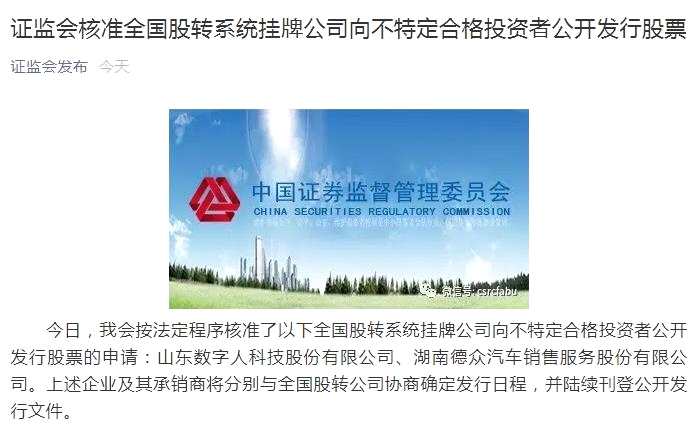摘要 【證監(jiān)會核準2家新三板公司向不特定合格投資者公開發(fā)行股票】今日,我會按法定程序核準了以下全國股轉(zhuǎn)系統(tǒng)掛牌公司向不特定合格投資者公開發(fā)行股票的申請:山東數(shù)字人科技股份有限公司、湖南德眾汽車銷售服務股份有限公司。上述企業(yè)及其承銷商將分別與全國股轉(zhuǎn)公司協(xié)商確定發(fā)行日程,并陸續(xù)刊登公開發(fā)行文件。(證監(jiān)會) 今日,我會按法定程序核準了以下全國股轉(zhuǎn)系統(tǒng)掛牌公司向不特定合格投資者公開發(fā)行股票的申請:山東數(shù)字人科技股份有限公司、湖南德眾汽車銷售服務股份有限公司。上述企業(yè)及其承銷商將分別與全國股轉(zhuǎn)公司協(xié)商確定發(fā)行日程,并陸續(xù)刊登公開發(fā)行文件。