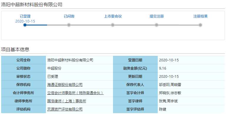 摘要: 10月16日,獲悉,洛陽中超新材料股份有限公司(下稱:中超股份)的科創(chuàng)板IPO申請已于近日獲上交所受理,保薦機構為海通證券。