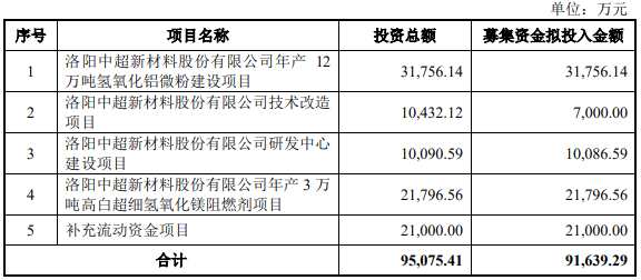 此次申報科創(chuàng)板,中超股份計劃發(fā)行股票不超過1,870.00萬股,擬募資9.16億元,將用于建設投資洛陽中超新材料股份有限公司年產12萬噸氫氧化鋁微粉建設項目、洛陽中超新材料股份有限公司技術改造項目、洛陽中超新材料股份有限公司研發(fā)中心建設項目、洛陽中超新材料股份有限公司年產3萬噸高白超細氫氧化鎂阻燃劑項目以及補充流動資金項目。具體情況如下: