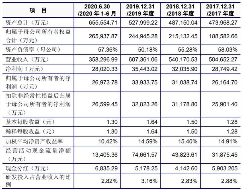 2017年-2020上半年,潤豐股份實現(xiàn)營業(yè)收入分別為50.47億元、54.01億元、60.74億元、35.83億元;同期歸屬于股東的凈利潤分別2.62億元、3.10億元、3.39億元、2.70億元。