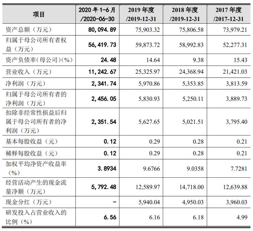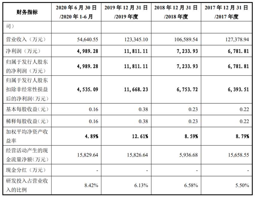 2017年-2020上半年,格林精密實現(xiàn)營業(yè)收入分別為12.74億元、10.66億元、12.33億元、5.46億元;同期歸屬于股東的凈利潤分別6781.81萬元、7233.93萬元、1.18億元、4989.28萬元。