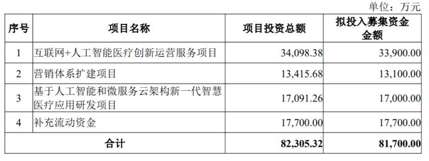 本次思創(chuàng)醫(yī)惠發(fā)行擬募集資金總額不超過人民幣8.17億元(含8.17億元),在扣除相關(guān)發(fā)行費用后,擬用于:互聯(lián)網(wǎng)+人工智能醫(yī)療創(chuàng)新運營服務(wù)項目、營銷體系擴(kuò)建項目、基于人工智能和微服務(wù)云架構(gòu)新一代智慧醫(yī)療應(yīng)用研發(fā)項目、補充流動資金。