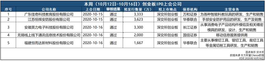 具體看來,2020年10月15日,深交所創(chuàng)業(yè)板上市委召開2020年第32次上市委員會審議會議,審核通過了2家企業(yè)創(chuàng)業(yè)板IPO申請:佳奇科技、恒輝安防。