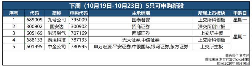 下周(10月19日-10月23日)將有5只新股可申購。其中,上交所科創(chuàng)板新股2只、上交所主板2只、深交所創(chuàng)業(yè)板新股1只。
