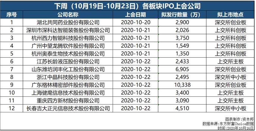 根據(jù)目前各板塊公布的公告顯示,下周(10月19日-10月23日)共計(jì)有12家公司將進(jìn)行上會接受IPO審核。