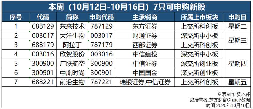 本周(10月12日-10月16日)有7只新股可申購。其中,上交所科創(chuàng)板新股3只、深交所創(chuàng)業(yè)板新股2只、深交所中小板2只。