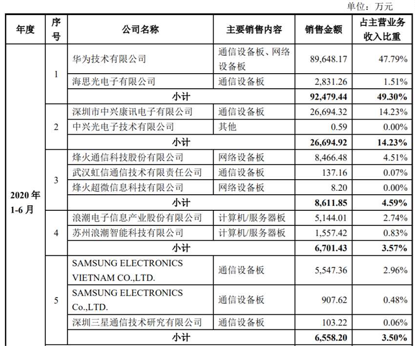 華為而且是生益電子的第一大客戶。2017年至2020年上半年,生益電子對華為的銷售金額分別為6.22億元、6.44億元和13.81億元和9.25億元。公司從2015年至2019年連續(xù)5年獲得華為“優(yōu)秀核心供應(yīng)商”。并且銷售占比在今年上半年主營收入的49.30%。