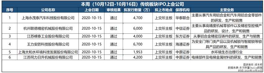 本周(10月12日-16日),有6家上會企業(yè)在傳統(tǒng)板塊接受IPO審核,并全部順利通過審核,過會率100%。所有企業(yè)都擬在上交所主板上市。