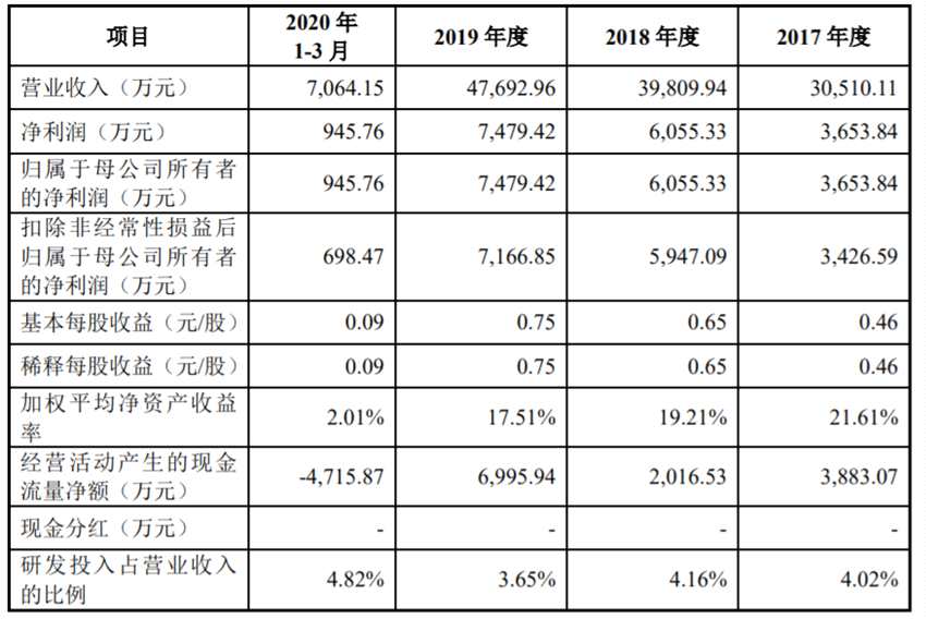 2017年-2020年一季度,佳奇科技分別實(shí)現(xiàn)營業(yè)收入3.05億元、3.98億元、4.77億元和7064.15萬元;歸屬于母公司所有者的凈利潤3653.84萬元、6055.33萬元、7479.42萬元和945.76萬元。