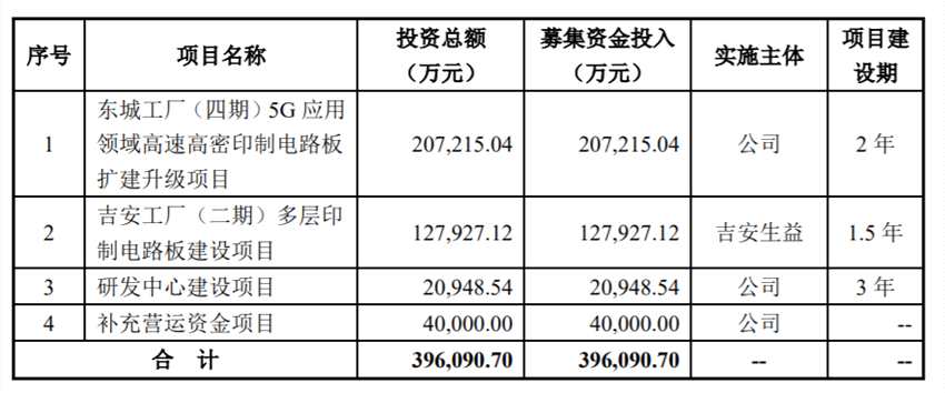 本次公司擬募集資金高達(dá)39.6億元,募集資金將用于東城工廠(四期)5G應(yīng)用領(lǐng)域高速高密印制電路板擴(kuò)建升級項(xiàng)目、吉安工廠(二期)多層印制電路板建設(shè)項(xiàng)目、研發(fā)中心建設(shè)項(xiàng)目和補(bǔ)充營運(yùn)資金項(xiàng)目。