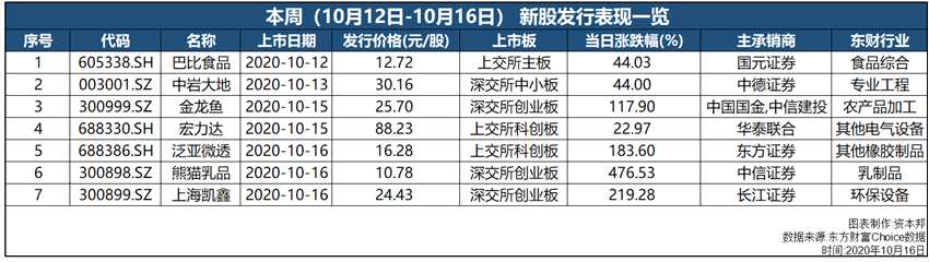 本周(10月12日-10月16日)共有7只新股上市,其中科創(chuàng)板新股2只、上交所主板新股1只、深交所創(chuàng)業(yè)板新股3只、深交所中小板1只。