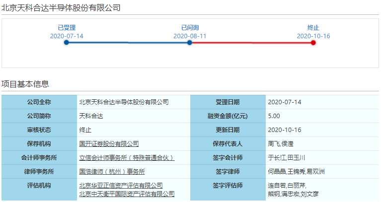 據(jù)悉,2020年10月15日,天科合達(dá)和保薦人國開證券分別向上交所提交了關(guān)于撤回首次公開發(fā)行股票并在科創(chuàng)板上市申請文件的申請,申請撤回申請文件。根據(jù)《上海證券交易所科創(chuàng)板股票發(fā)行上市審核規(guī)則》第六十七條的有關(guān)規(guī)定,上交所決定終止對該公司首次公開發(fā)行股票并在科創(chuàng)板上市的審核。