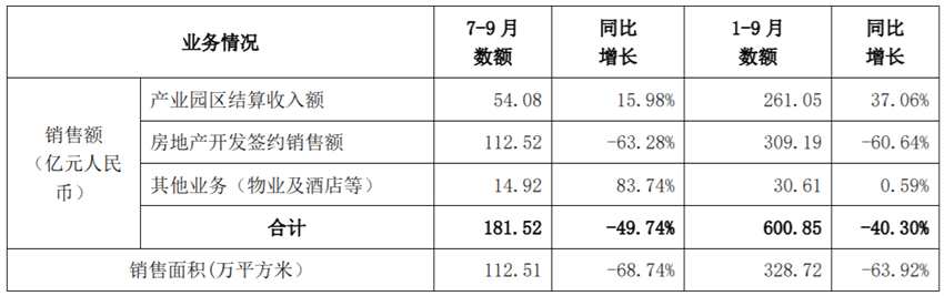 分不同業(yè)務(wù)來看,在今年9月底前的銷售額中,產(chǎn)業(yè)園區(qū)結(jié)算收入額為261.05億元,同比增長37.06%;房地產(chǎn)開發(fā)簽約銷售額為309.19億元,同比下降60.64%;其他業(yè)務(wù)(物業(yè)及酒店等)銷售額為30.61億元,同比增長0.59%。